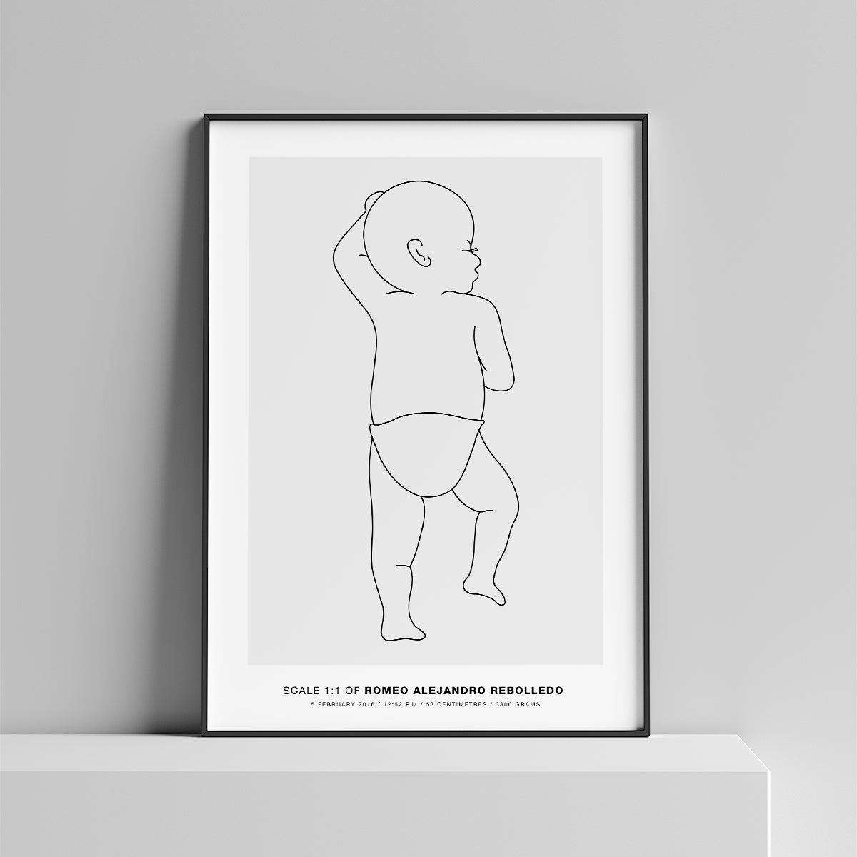 Simply fill out your desired baby orientation and background colour, along with your child’s full name, their date of birth, time of birth, length and weight at birth.