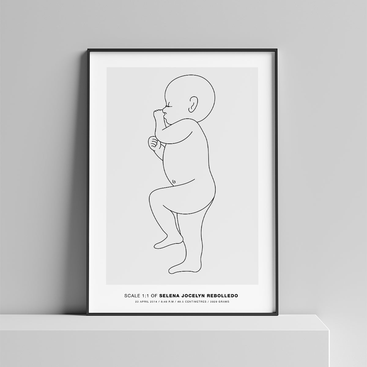 Simply fill out your desired baby orientation and background colour, along with your child’s full name, their date of birth, time of birth, length and weight at birth.